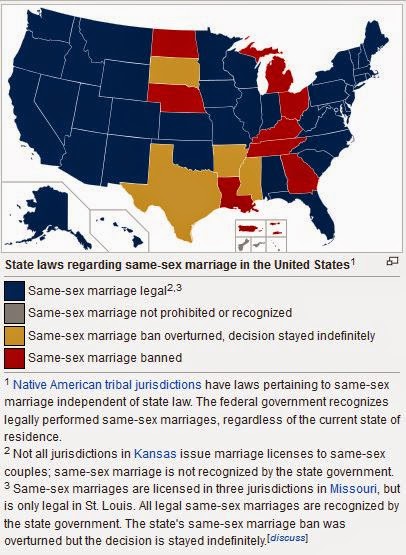 As of today, 37+ states plus Washington DC issue marriage licenses to same-sex couples and recognize our marriages from other areas: Alabama, Alaska, Arizona, California, Colorado, Connecticut, Delaware, Florida, Hawaii, Idaho, Illinois, Indiana, Iowa, Kansas (in select counties), Maine, Maryland, Massachusetts, Minnesota, Montana, Nevada, New Hampshire, New Jersey, New Mexico, New York, North Carolina, Oklahoma, Oregon, Pennsylvania, Rhode Island, South Carolina, Utah, Vermont, Virginia, Washington, West Virginia, Wisconsin, and Wyoming. And then there is Missouri, which allows same-sex marriage in the city of St. Louis, plus St. Louis County and Jackson County. The state of Missouri recognizes marriage performed in each of these three jurisdictions. The rest of the state is halted by a judicial stay.