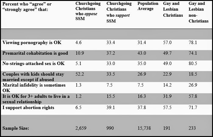 Churchgoers who oppose same-sex marriage sense that they are out of step with the rest of the nation about sex and relationships. (The numbers above reinforce that.) And Christians who favor legalizing same-sex marriage often remain embattled with those who oppose it, and yet sense that their own views on sexuality still lag behind those gay and lesbian Christians from whom they’ve have become convinced of the legitimacy of same-sex marriage. That, too, is true. Gay and lesbian Christians, in turn, have much in common with gay and lesbian non-Christians—their social circles often overlap. The sexual norms of the former are not as permissive as those of the latter but are still well above the national average in permissiveness. The latter likely constitutes a reference group for gay and lesbian Christians (together with heterosexual Christians with whom they are in fellowship).His research interviewed nearly 16,000 Americans between the ages of 18 and 60 earlier this year. He asked them if viewing pornography was okay; if it is a good idea for couples to live together outside of marriage; if it is okay for two people to have "no strings attached" sex; if a married couple should remain together (barring abuse) for the sake of their kids; if it's okay for a married person to have adultery; if it's okay for three or more people to live together as a romantic group; and if they support abortion rights.