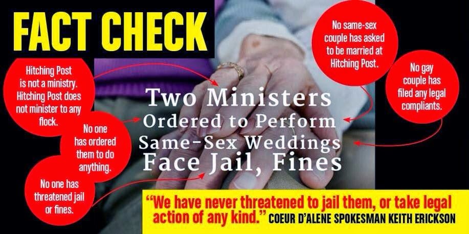 Remember the Hitching Post Lakeside Chapel that recently filed a federal lawsuit against the city of Coeur d'Arlene with the assistance of Alliance Defending Freedom? The commercial wedding chapel is suing over a public nondiscrimination ordinance that bars local businesses from discriminating against customers on the basis of sexual orientation -- as well as race, gender, religion, etc. The chapel's owners claimed that they were contacted by a gay person for a wedding. They say they turned away that customer and now the city is going to fine them out of assistance and send them to jail.